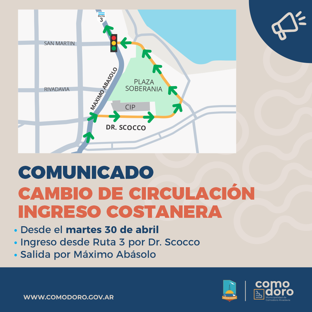 Se accederá por calle Dr. Scocco y se egresará por el semáforo de San Martín y Máximo Abásolo. El cambio de sentido se implementará a partir del martes 30 de abril. La medida vial apunta a brindar mayor seguridad en los conductores y peatones.