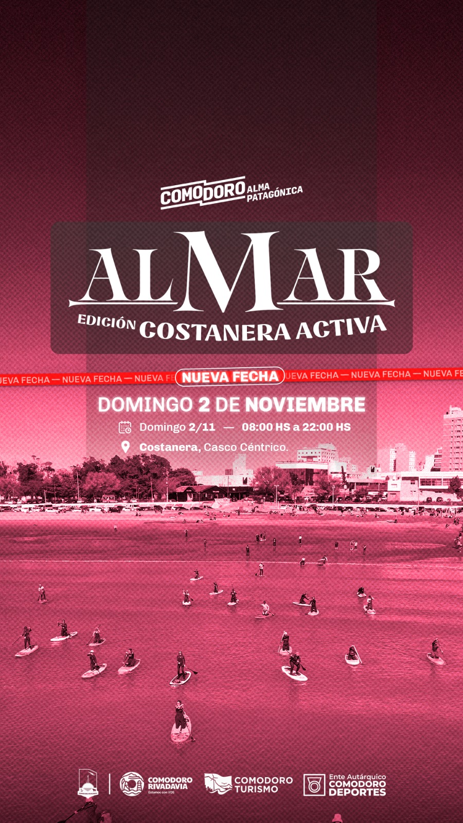Estimados: En virtud del pronostico previsto para el día sábado 1 de noviembre, y en favor de un mejor desarrollo de las actividades planificadas para el Evento Al Mar, es que se definió desde la organización reprogramar el mismo para el día domingo 02/11 respetando el cronograma de horarios vigente. Quienes tengan dudas o consultas por inscripciones o servicios ya contratados deberán dirigirse a los referentes de cada actividad. Desde ya el agradecimiento por acompañar en la realización y difusión del evento, los esperamos para disfrutar juntos de esta fiesta Náutica en la Costanera de la ciudad