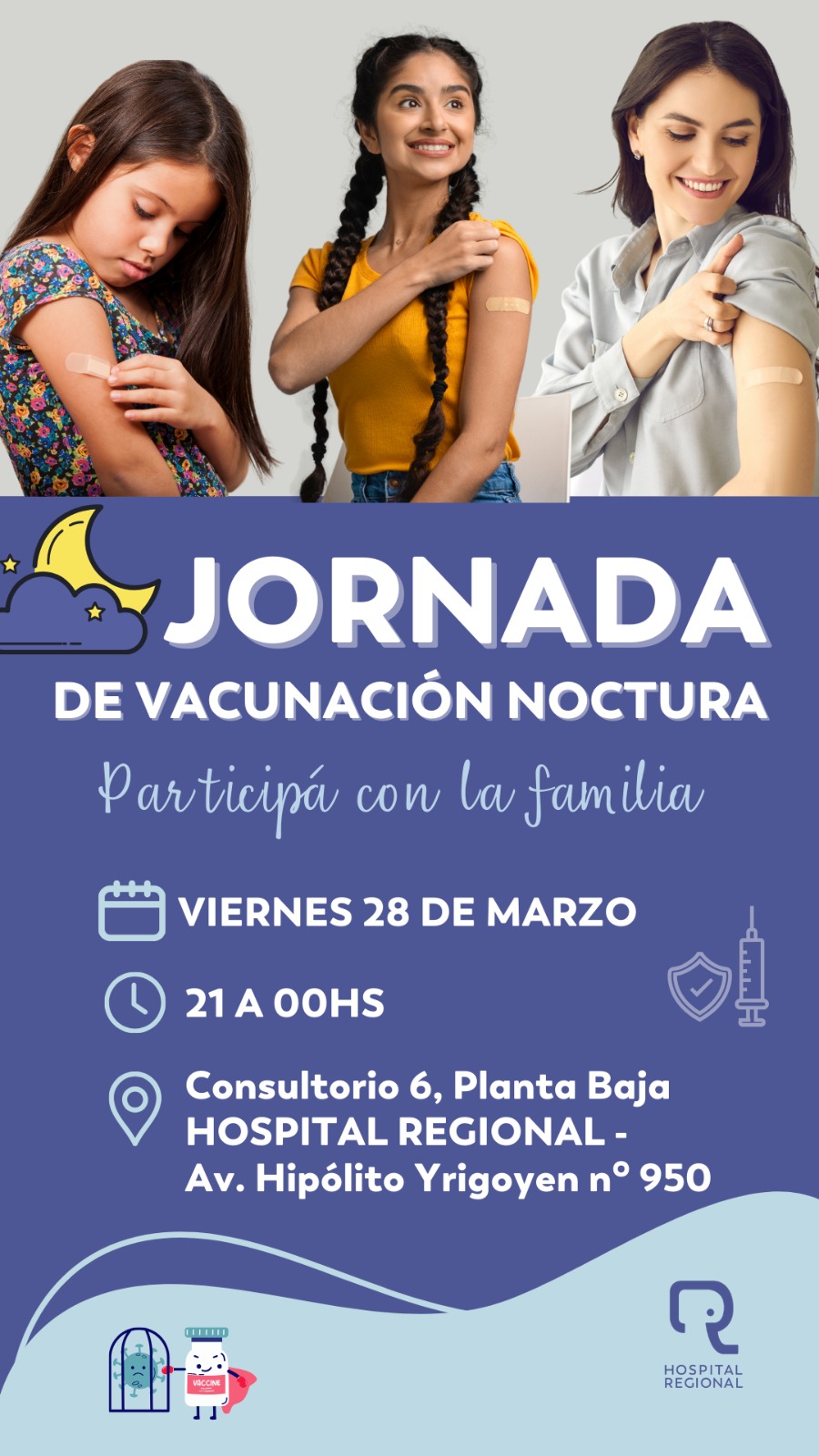 - el Vacunatorio Central del Hospital Regional, ubicado en Av. Hipólito Yrigoyen n° 950 de 21 a 00hs. Será una Jornada de Vacunación Nocturna