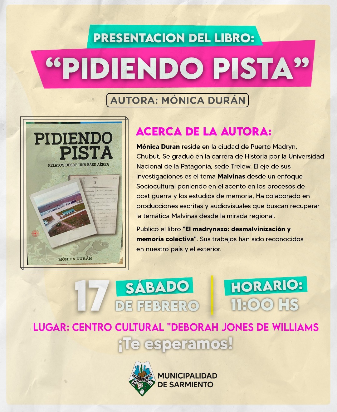 La Secretaría de Cultura acompañará la presentación del libro referido al rol de la base aérea de Río Gallegos en el marco del conflicto bélico de Malvinas. La profesora de historia y escritora, Mónica Durán, realizará la presentación de su libro «Pidiendo Pista» en el Centro Cultural «Deborah Jones de Williams» de Sarmiento. El evento será a las 11:00 y expondrá su trabajo donde toma el caso de la Base Continental de Río Gallegos, reconstruye el año 1982 con testimonios a excombatientes-Artilleros de la Fuerza Aérea- enviados a Puerto Argentino para la defensa de la pista y al resto del personal que actuó desde esta Base en la provincia de Santa Cruz.